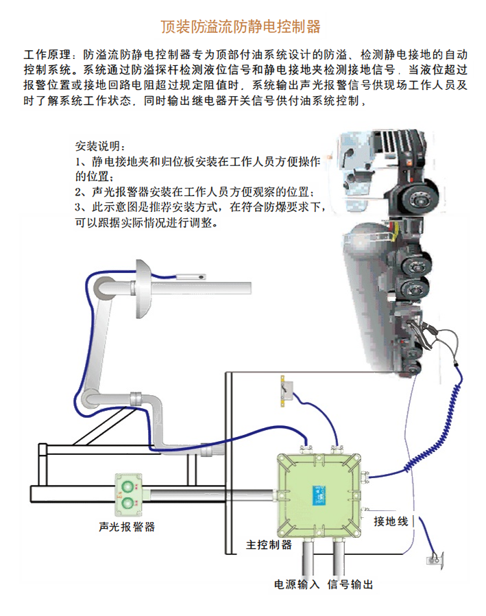 工作原理:防溢流防靜電控制器專為頂部付油系統(tǒng)設(shè)計的防溢、檢測靜電接地的自動控制系統(tǒng)。系統(tǒng)通過防溢探桿檢測液位信號和靜電接地夾檢測接地信號,當(dāng)液位超過報警位置或接地回路電阻超過規(guī)定阻值時,系統(tǒng)輸出聲光報警信號供現(xiàn)場工作人員及時了解系統(tǒng)工作狀態(tài),同時輸出繼電器開關(guān)信號供付油系統(tǒng)控制,
